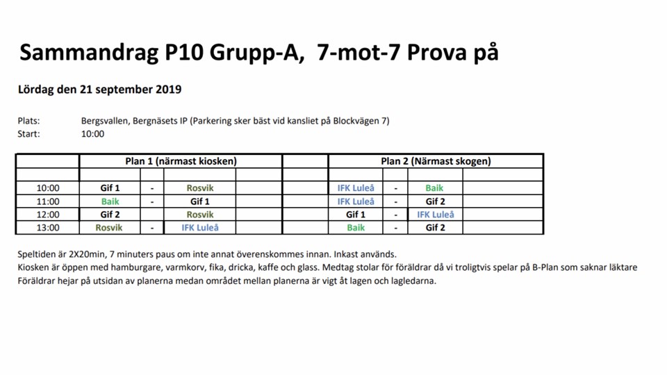 Hej! Snart dags för nytt sammandrag. Vi kommer denna gång att möta Sunderbyn samt LIRA. Samling 12:40 vid 3v3 planerna. Första match är 13:00 Sista match är 15:20 Följande spelare har anmält sig: Viktor Strömberg Olof Söderasp Isak Lilja William Wikström Ville Söderman Dennis Segerlund Viktor Sjögren Elis Jakobsson Frank Mörtberg Melker Dagman Elias Wallin Leo Åsberg Erik Djurberg Amir Sam Malak Zada