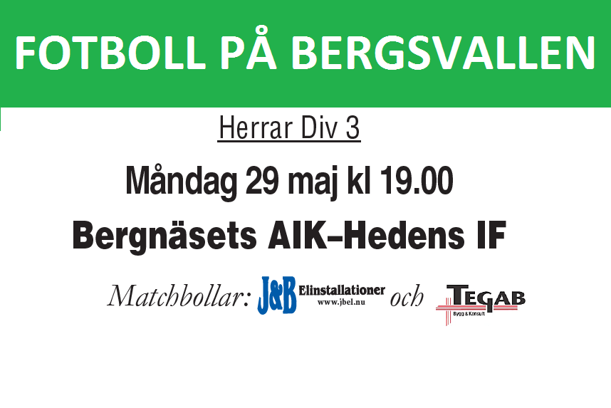 Herrlaget tar emot Hedens IF ikväll kl. 19:00. Sväng förbi Bergsvallen och heja fram grabbarna till 3 poäng. Kiosken är öppen och fylld med gosaker. 50:- inträde för vuxna. Matchbollarna sponsras av J&B Elinstallationer och Tegab Bygg och Konsult.