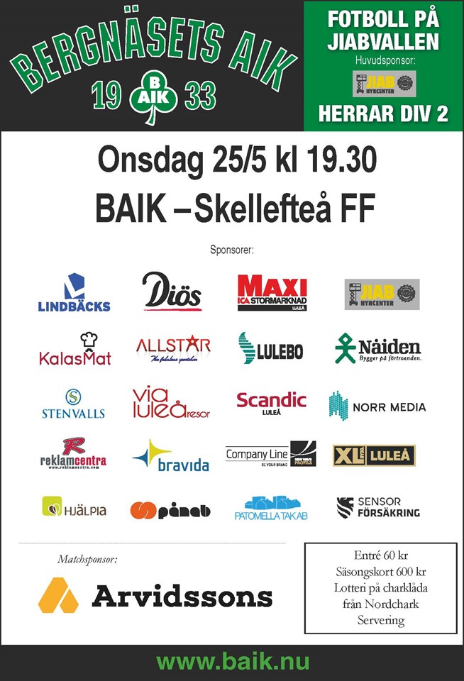 Topplaget Skellefteå visade sig för svåra denna kväll. Men hemmalaget kan lämna JIABvallens gröna matta med huvude högt. Skellefteå rivstartar matchen och gör 1-0 redan i första minuten. I minut 11 vinner Ante bollen på motståndarnas tredjedel och spelar fram Max som behärskat placerar in 1-1. Lagen byter chanser och i minut 22 tar SFF återigen ledningen. Skellefteå fortsätter att försöka kontrollera matchen och BAIK jagar kvittering. Vi hittar också några chanser att kvittera men i 87:e minuten gör SFF 3-1 när vi öppnar oss i vår iver att kvittera. Sammantaget en bra insats av hela laget vilket gör att vi ser fram emot derbyt mot serieledande IFK Luleå på måndag.