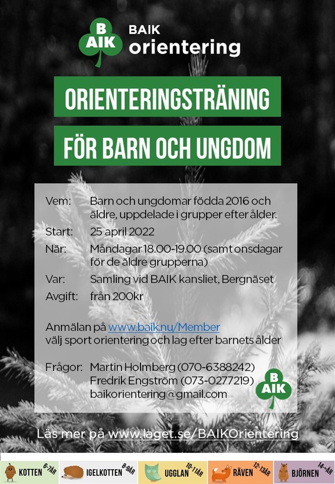 Nu hoppas vi att marken snart börjar titta fram igen och då är det dags att damma av orienteringsskorna! Vi kör igång med träning för våra barn och ungdomsgrupper den 25 april för barn födda 2016 och äldre. Både nybörjare och orienteringsvana barn och ungdomar är välkomna i samtliga grupper. Vi tränar som vanligt måndagar kl 18-19, ofta med Bergnäset som startpunkt (annars skriver vi det i förväg). Det äldre grupperna kommer även att träna på BAIK:s klubbträning på onsdagar med övriga orienterare. Anmäler er på "Bli medlem" och välj sport "orientering" och lag efter barnens ålder. Information om anmälan Plansch Vi ses i skogen! /Ledarna - Bergnäsets AIK Orientering PS. Vill du hjälpa till som ledare? Då är du hjärtligt välkommen! Hör av dig till någon av kontaktpersonerna så tar vi en dialog.