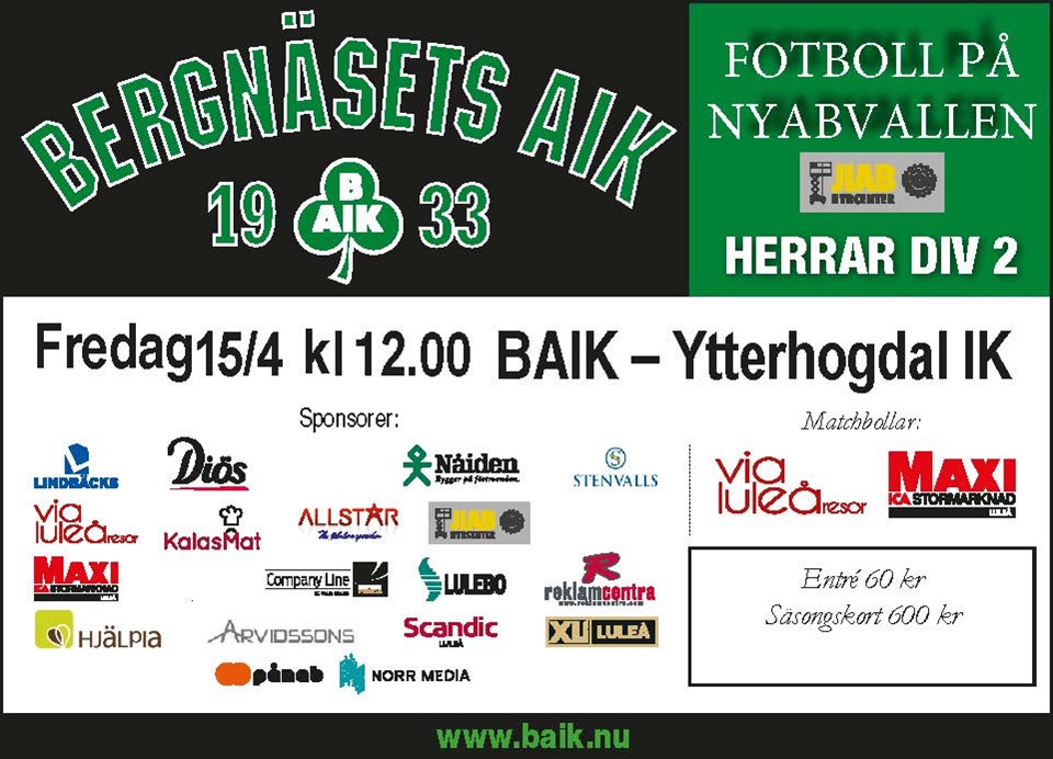 Fredag 15/4 kl. 12.00 har vi återigen hemmamatch när gästerna från Ytterhogdal kommer på besök till NYABvallen. Tyvärr är inte vår hemmaplan JIABvallen spelbar ännu efter senaste snöovädret. Vi ser fram emot en bra match och ett härligt Påskfirande.