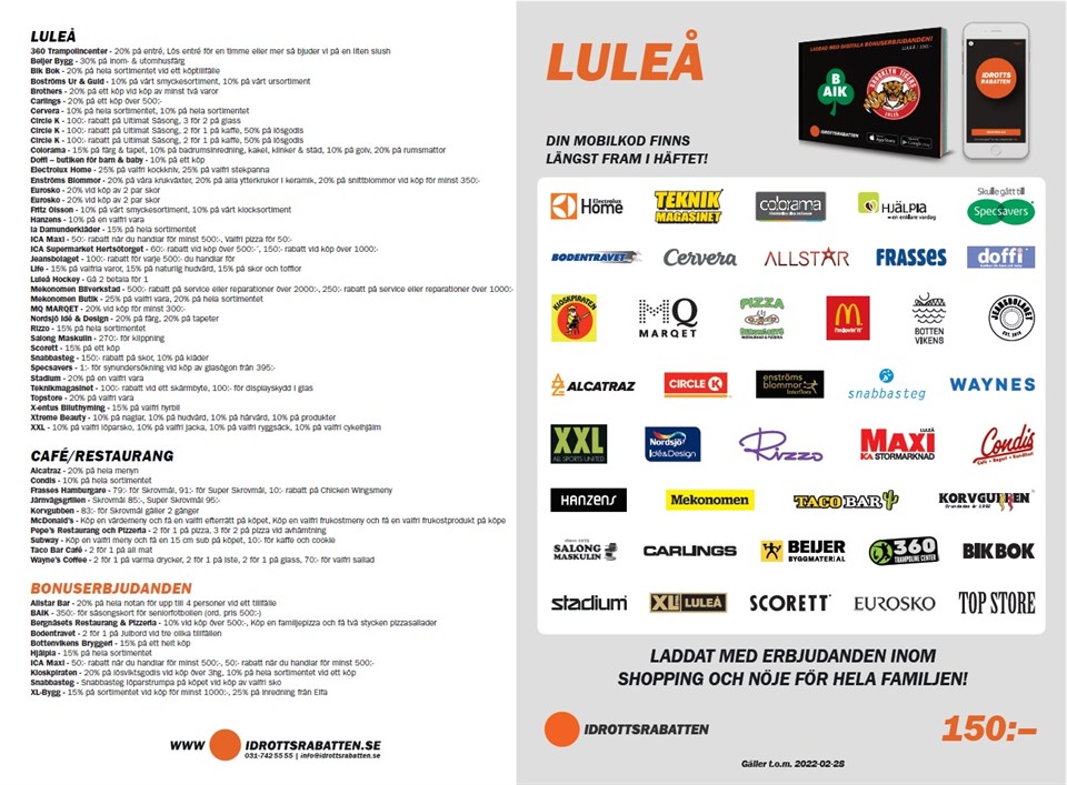 Stöd oss genom att köpa ett rabatthäfte. För 150 kronor får du massor av bra rabatter. Vi har även Baikspecifika rabatter som du kan se under rubriken ”Bonuserbjudanden” i bilden. Dessa erbjudanden kommer du endast åt via appen "Idrottsrabatten" som finns gratis både till Android och IPhone. Just nu säljer alla våra orienterare och fotbollsspelare dem. Om du inte kan köpa via dessa så kan du också köpa via vårt kansli.