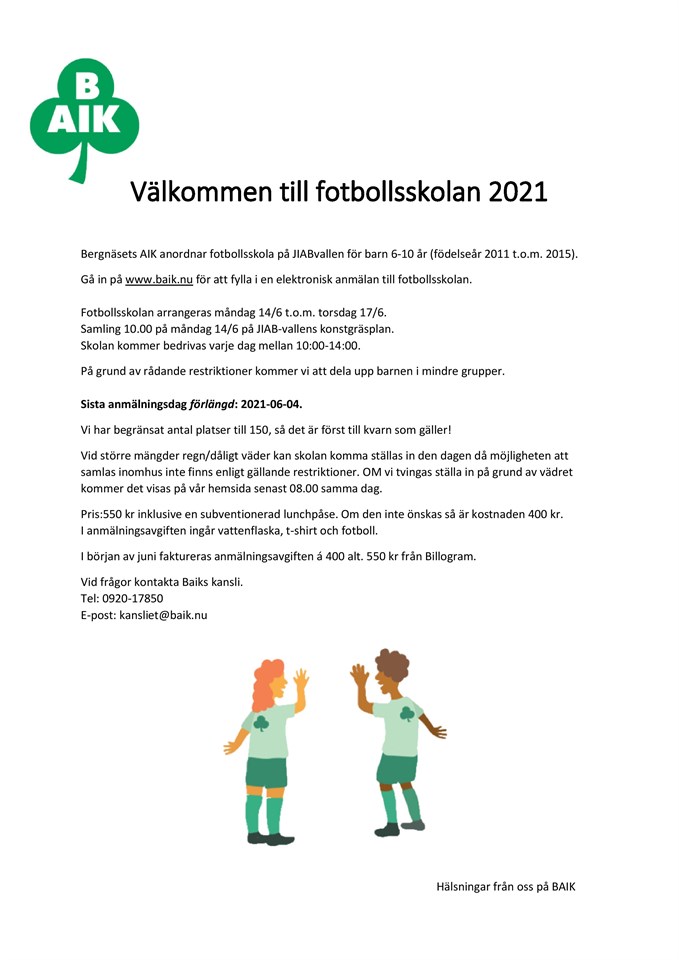 Vi har valt att förlänga sista anmälningsdatum på fotbollsskolan så att så många som möjligt har en chans att hinna söka! Sista anmälningdag är nu på fredag 4/6. Vid frågor, kontakta kansliet på kansliet@baik.nu Njut av solen och passa på att besöka JIABvallen för att nu även kunna se seniorlagen spela matcher, 100 platser så först till kvarn!