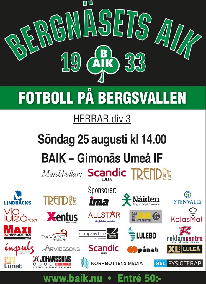 Välkommen till Bergsvallen imorgon söndag kl 14.00 för att se vårt division 3-lag ta emot Gimonäs. Ett stort tack till våra fantastiska sponsorer! Bergnäsets AIK 24 aug 2019 0kommentarer