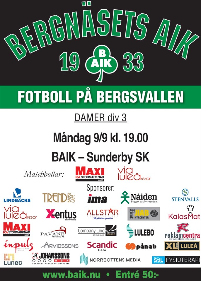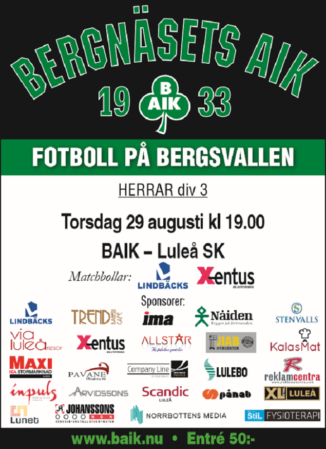 Välkommen till Bergsvallen ikväll torsdag kl 19.00 för att se vårt division 3-lag ta emot Luleå SK. Ett stort tack till våra fantastiska sponsorer! Bergnäsets AIK 29 aug 2019 0kommentarer