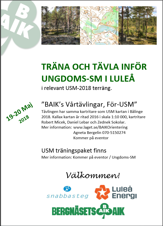 Ta chansen att träna och tävla i relevant USM-2018 terräng i Luleå den 19-20 maj. Se affischen! Inbjudan och information om boende med bra priser på Scandic finns på Eventor https://eventor.orientering.se/Events/Show/17950 Information om USM 31/8-2/9 i Luleå och träningspaket finns på http://usm2018.blogspot.se/ https://eventor.orientering.se/Events/Show/16819 BAIK Orientering 15 apr 2018 0kommentarer