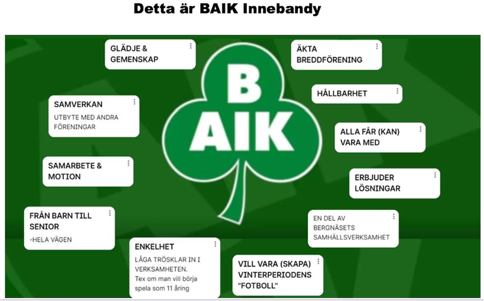 Hej föräldrar i Baik Innebandy P-16! Nu finns ett ny tid bokad för Sektionsarbete inom BAIKs innebandysektion. Söndag 15/1 kl 16:00-19:00 Plats: idrottens hus, maskinvägen 27, Bergnäsets industriområde Mat ingår Baiks ambition är att vi blir några från varje lag helst några föräldrar utöver ledarna. Det handlar mycket om att lyssna in och hjälpa till med tankar och ideér som kan underlätta för lagen framöver. Meddela någon av oss ledare på träningen 10/1 eller under veckan genom att, skriva en kommentar i nyheten eller maila/sms någon av ledarna direkt om ni har möjlighet att delta på mötet från vårt P-16 lag. För mer info: se nedan eller i dokumenten Sektionsinformation på lagsidan på laget.se. Med vänlig hälsning, ledarna P-16 Kort bakgrund BAIK är en ideellförening där det förväntas att vi alla hjälps åt. Bakgrund: Under hösten 2022 har en grupp frivilliga individer påbörjat ett arbete för att skapa en ny typ av struktur inom innebandyn. Detta för att i framtiden ska vara enkelt att vara en del av vår innebandy (som ledare, aktiv och förälder). Vi ska jobba för att fler engagerar sig i liten skala än att någon får ett övermäktigt uppdrag. Här kommer just du som förälder in! Under föregående möten har vi kommit fram till att några områden som vi kommer utgår från (kan såklart bli fler eller färre) - Kommunikation - Utbildningskoordinator - Administration - Ekonomi (sponsring/ samordna försäljningar) - Strategi/samordning (följa upp strategiska planer) - Ledarsupport - Seriekoordinator - Lokalansvar (bokningar) Ca 2-3 personer från varje lag kommer behövas och detta ska i första hand inte vara ordinarie ledare/tränare, prata ihop dig med ledarna för mer information somt kommande mötesdatum. Vid frågor kontakta Jens Lundqvist 070-531 59 50