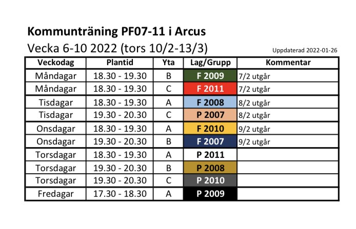 Hej igen. Nu har det kommit ut tider för de gemensamma kommunträningarna för F-10. Som jag har förstått det så är det bara att komma dit och vara med. Se bifogad bild för träningstider. Har ni ingen annan träning som krockar så åk gärna dit och testa. När? Onsdagar kl: 1830-1930 Var? Arcushallen, yta: A Hur? Tränarleda fotbollsträningar. Kom ombytt. Vi jobbar på att få till några egna tider i Arcus. Mvh /Robert /